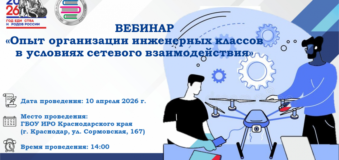 Государственное бюджетное образовательное учреждение дополнительного профессионального образования «Институт развития образования» Краснодарского края проводит вебинар по теме: «Опыт организации инженерных классов в условиях сетевого взаимодействия».